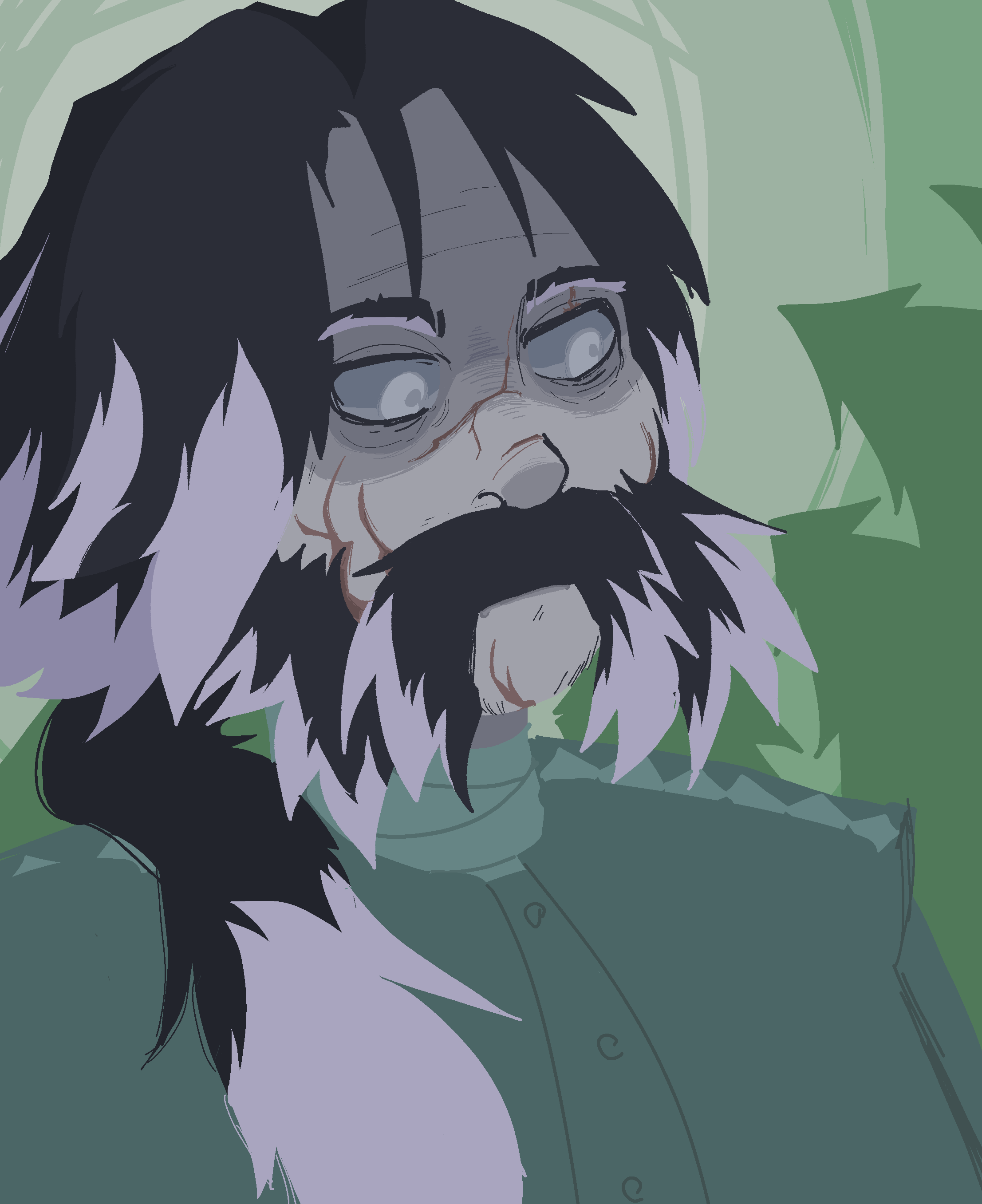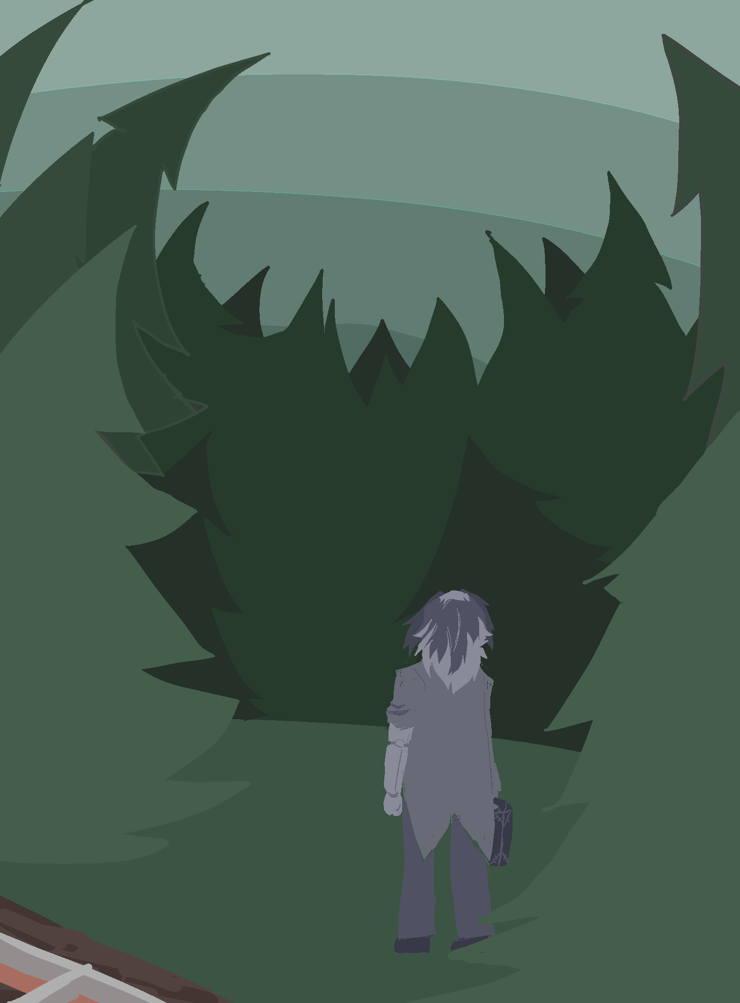 Tramping through the woods, up the hill, through the trees. You would've picked up a sweat, if you were able to do that anymore. Your metallic skin brushes dryly against your clothing. Your mismatched arms push apart bushery and foliage.